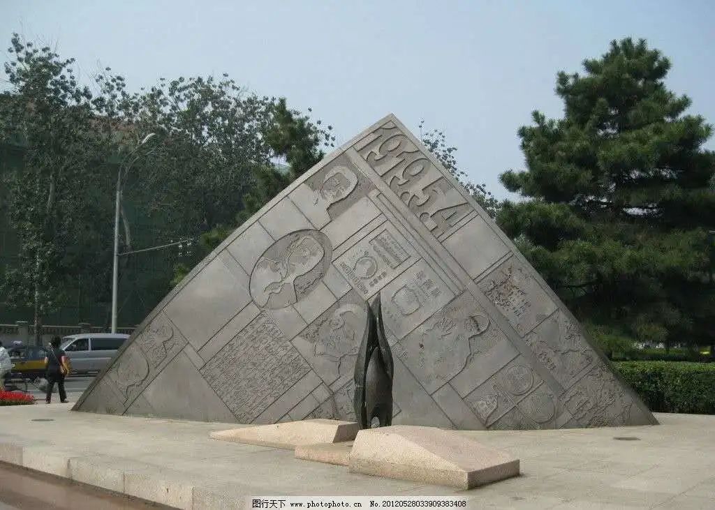 五四纪念碑位于皇城根遗址公园沙滩路口,与北大红楼隔路相望。纪念碑被设计为一-张写着“1919.5.4" 字样的旧报纸造型,刻有浮雕作品《翻开历史的一页》,包含“五四运动”时期新思想的代表人物陈独秀、鲁迅等。